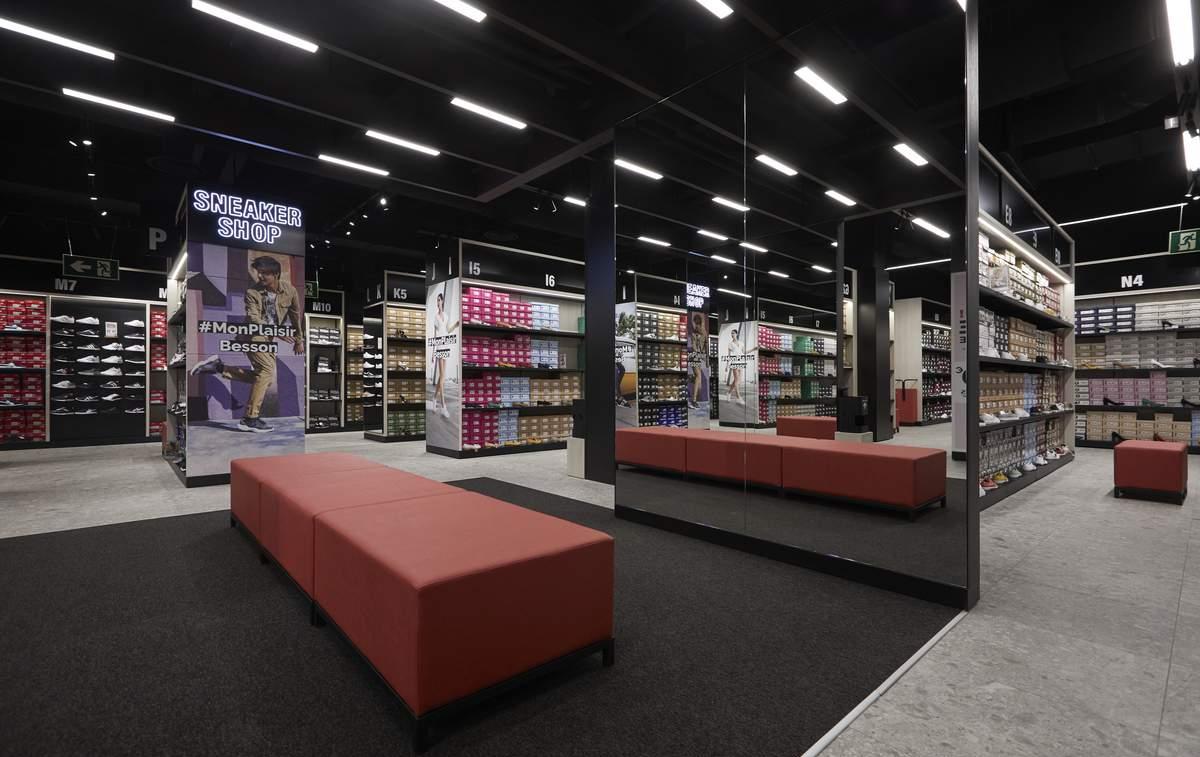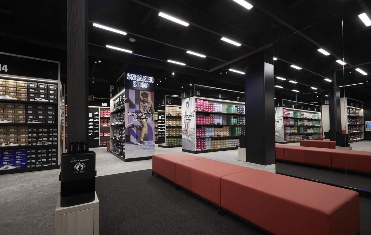 Le fond du magasin héberge l’ensemble de l’offre de sneakers et de marques de sport street de l’enseigne, organisée par cibles et réunie au sein du Sneaker shop.