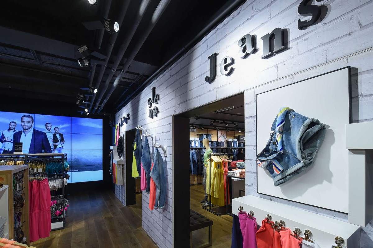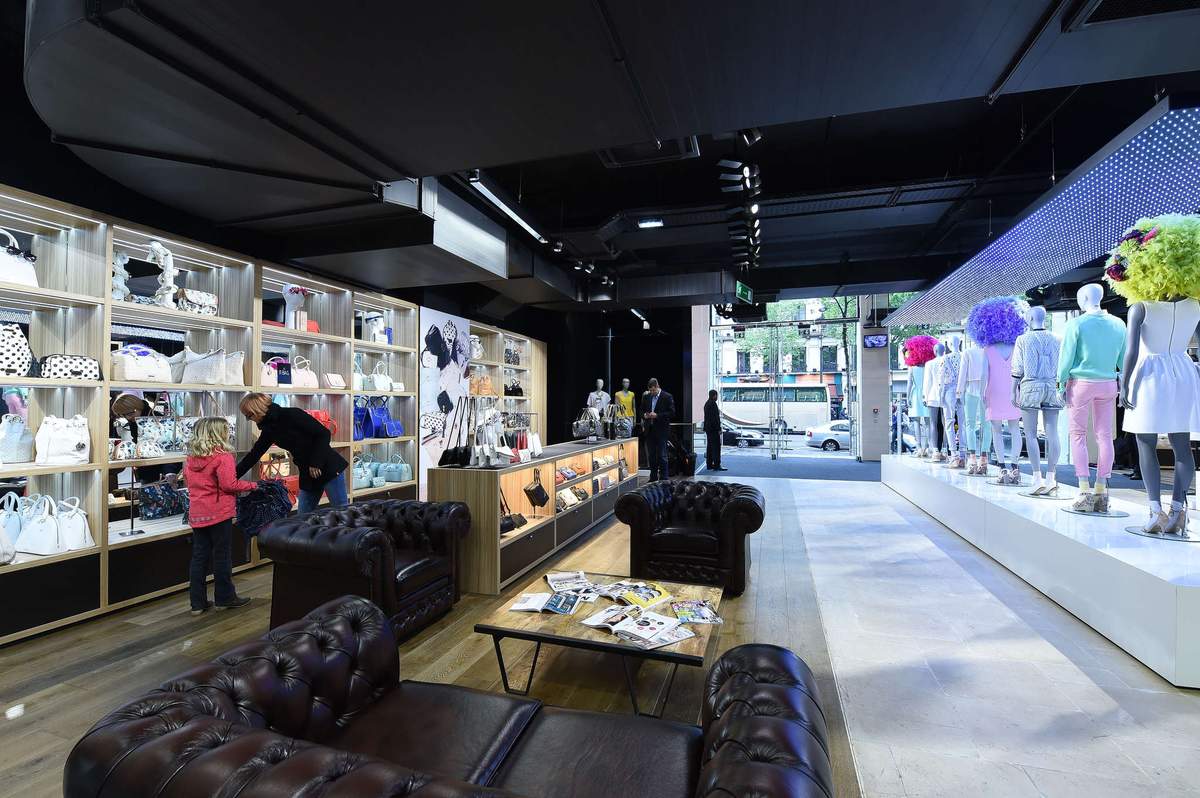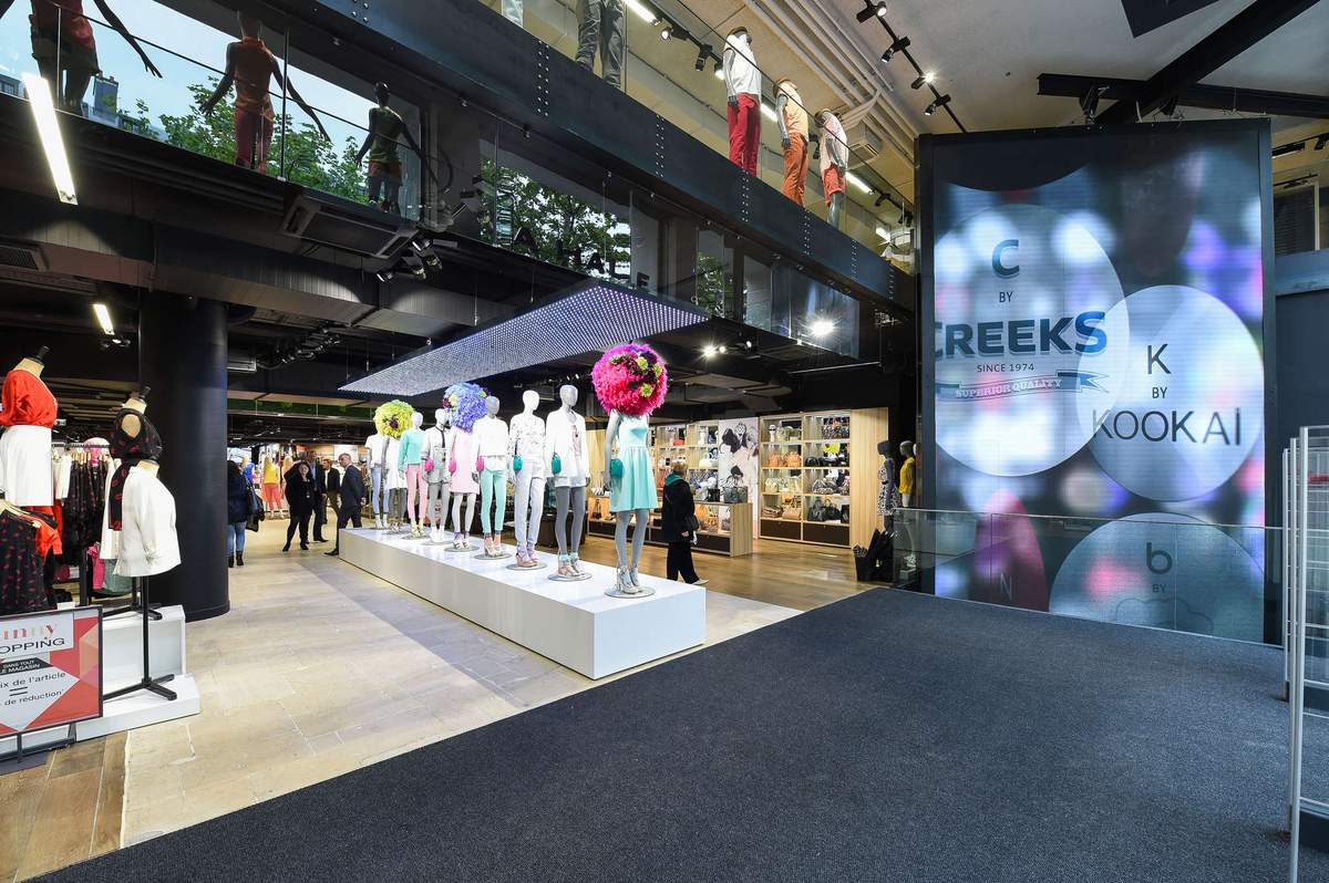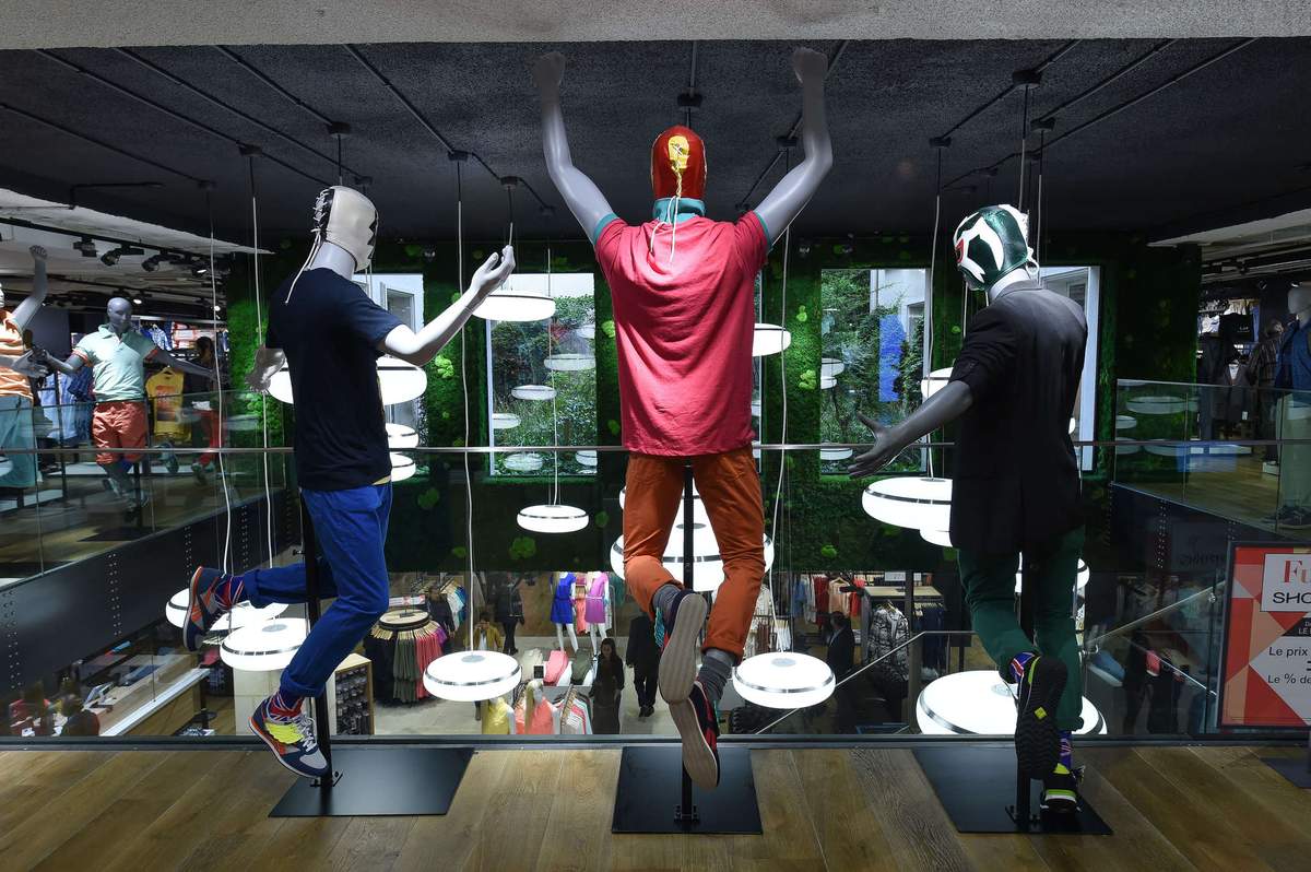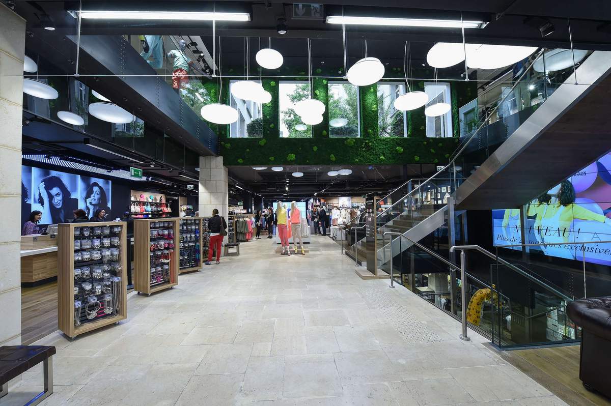 La façade du magasin est entièrement ouverte sur le Boulevard, comme une immense surface vitrée animée d'un écran géant de plus de 5 tonnes. Le catwalk concentre l'attention sur la promesse de l'enseigne, une mode fun, colorée et joyeuse, animée de grandes marques.