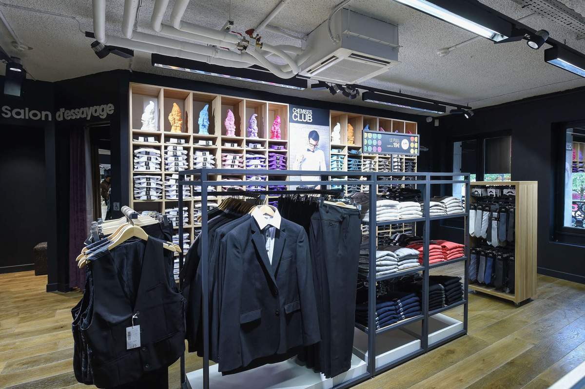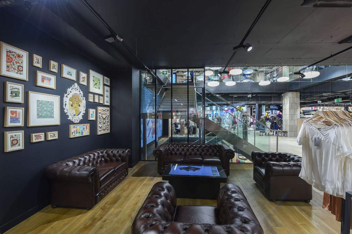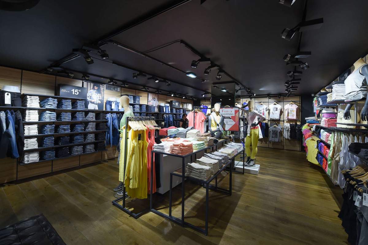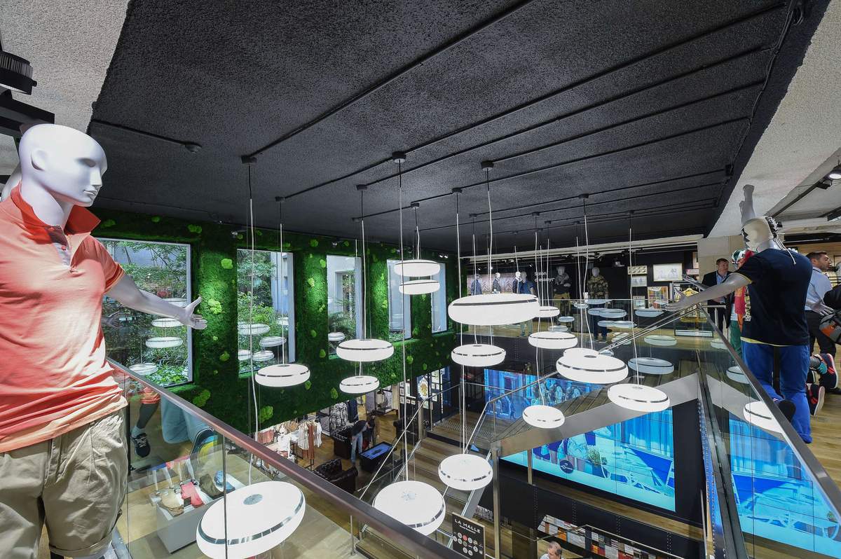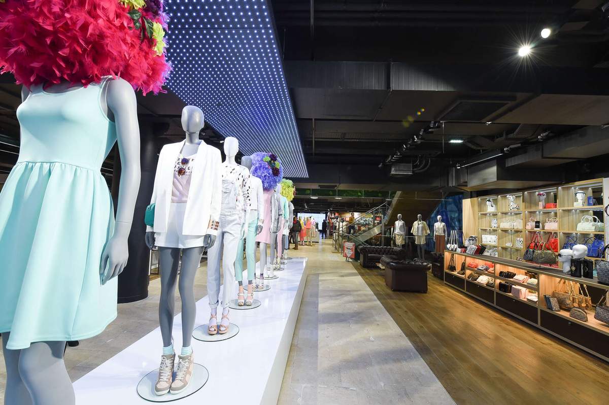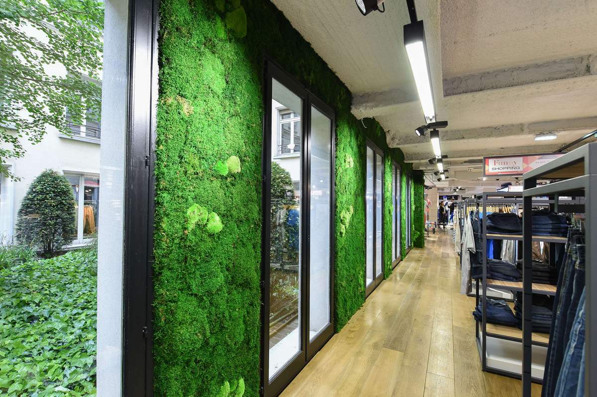 La façade du magasin est entièrement ouverte sur le Boulevard, comme une immense surface vitrée animée d'un écran géant de plus de 5 tonnes. Le catwalk concentre l'attention sur la promesse de l'enseigne, une mode fun, colorée et joyeuse, animée de grandes marques.