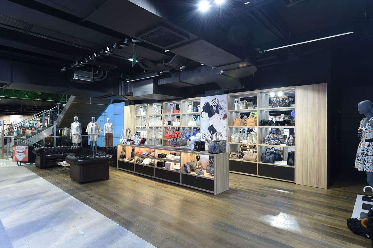 Le rez-de-chaussée est destiné aux marques dédiées à la Femme, et se trouve rythmé par une imposante bibliothèque valorisant la Maroquinerie ainsi que par un espace dédié au Denim.